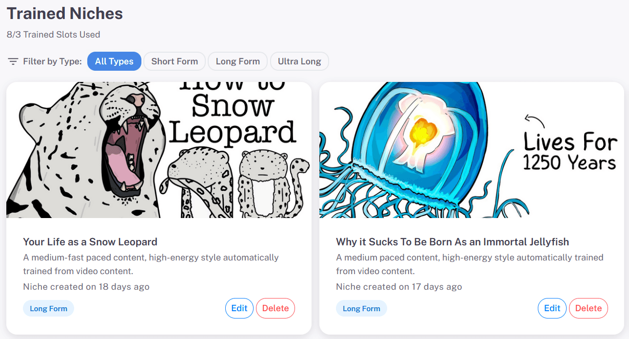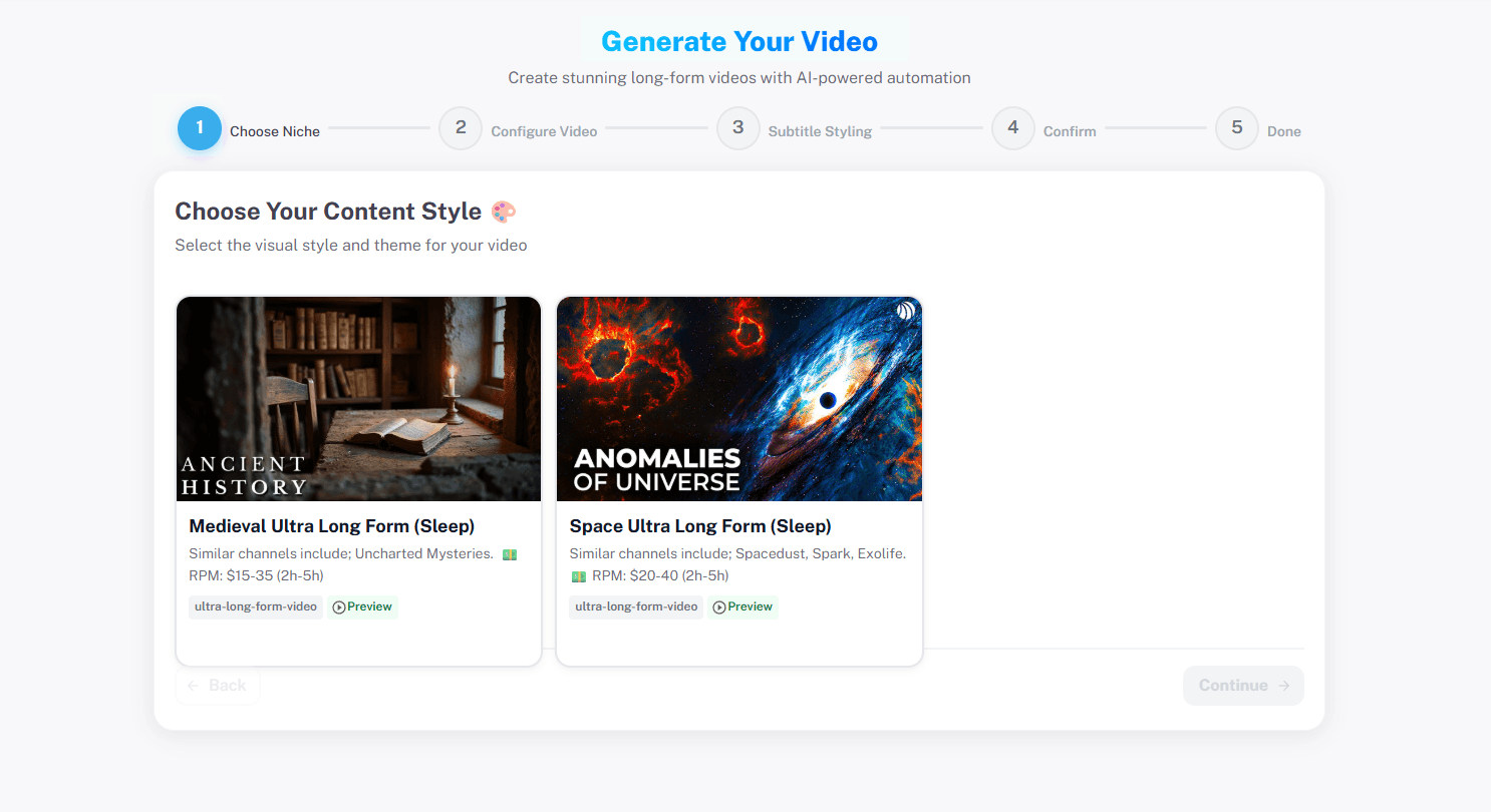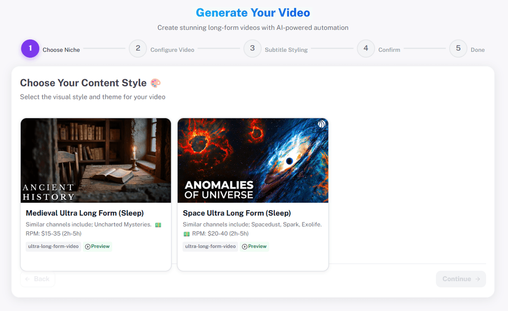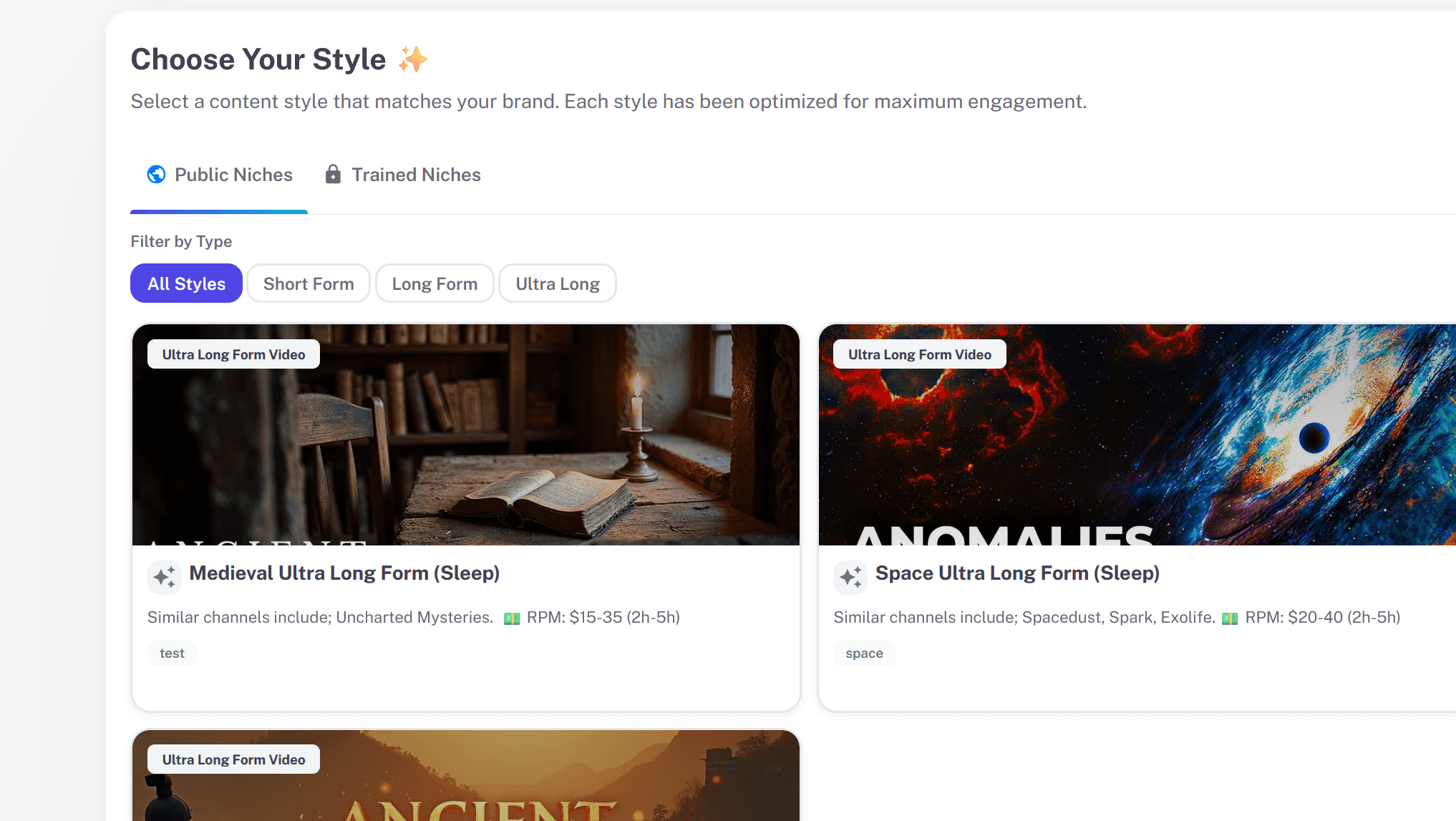 Browse profitable ultra-long-form niches pre-trained for pacing, tone, and storytelling. Select one of our custom proven ultra long form niches, to create in minutes.