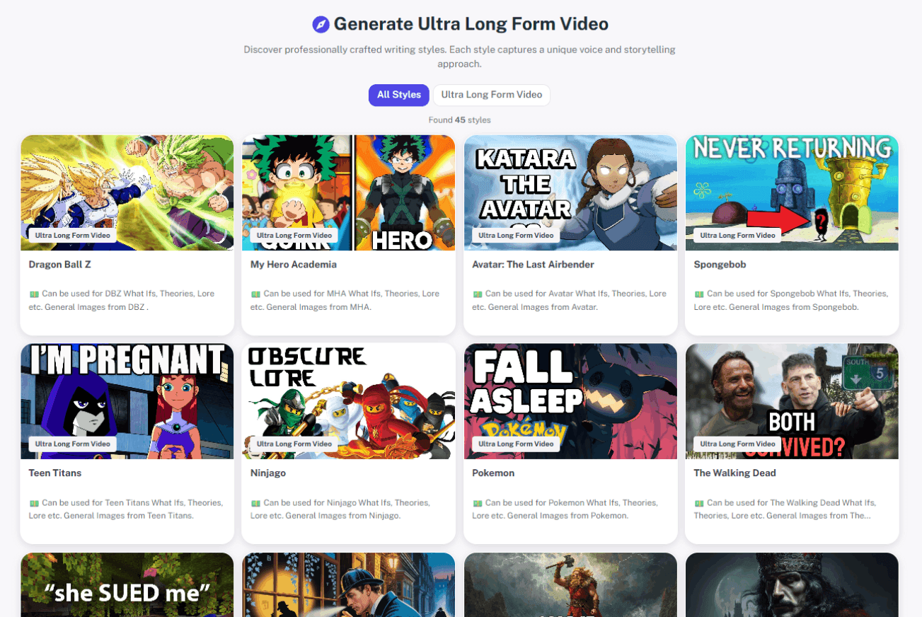 Browse profitable ultra-long-form niches pre-trained for pacing, tone, and storytelling. Select one of our custom proven ultra long form niches, to create in minutes.